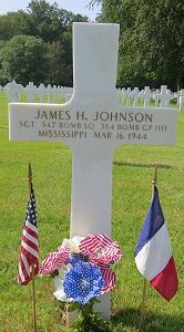 Sgt James H. Johnson enlisted in Hartford, Connecticut on 21 January 1943.The aircraft was hit by flak and set on fire before the target. The pilot made a crash-landing just north of L’Huitre, six miles south of Mailly-le-Camp, France. Two men were killed, eight men survived and were takn prisoner.