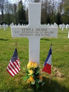 Pvt Lynn E. Milner was first buried at Temporary American Military Cemetery Champigneul, France.Source of information: Peter Schouteten, www.abmc.gov, www.wwiimemorial.com, www.ancestry.com - Headstone and Interment Record / 1930/1940 Census / Tommy’s Tree, http://www.ww2-airborne.us
