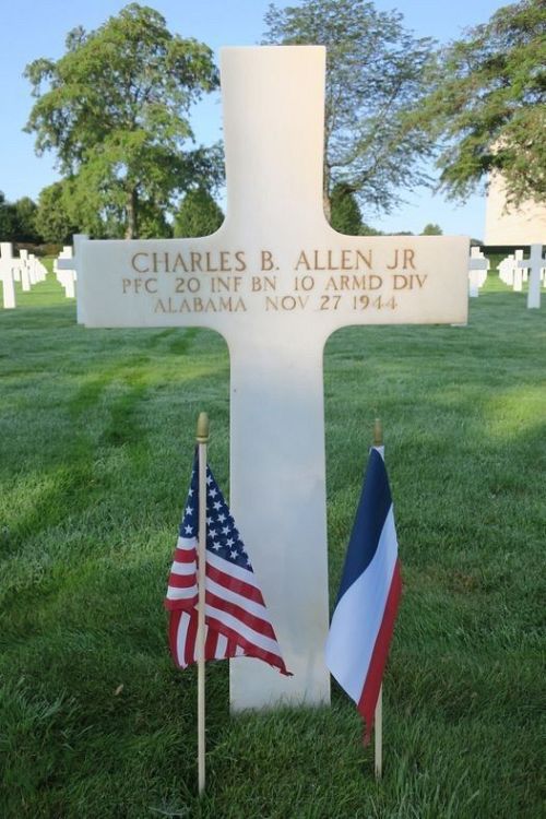 Pfc Charles B. Allen Jr. graduated from Boys High School in Atlanta in 1943 and was a clerk before he enlisted at Fort McPherson, Georgia on 14 August 1943.He was first buried at the Temporary American Military Cemetery in Limey, France.