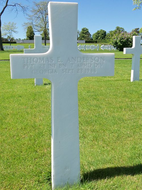 Pvt Thomas E. Anderson was married to Valiree Crotts on 12 November 1943, Russell County, Alabama.Source of information: André Koch, www.abmc.gov, www.wwiimemorial.com, www.ancestry.com - 1920/1930/1940 Census / Headstone and Interment Record / Alabama, County Marriages, 1805-1967, https://www.7tharmddiv.org, www.newspapers.com - The Atlanta Constitution 14 February 1945
