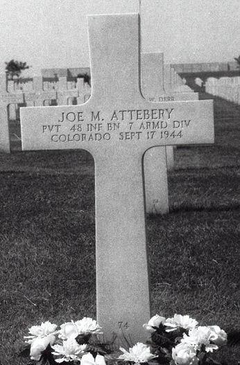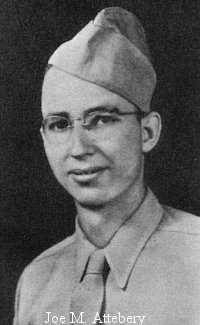 Pvt Joe M. Attebery was a chauffeur before he enlisted on 30 June 1943. He was sent overseas in June 1944, arriving in France in August.He was wounded in his loins and abdomen by artillery fragments. He died in the 34th Evacuation Hospital that was stationed in Verdun, France at that time.