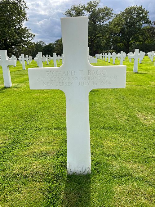 Lt Bagg was killed due to an extremely deep cut on left side of skull. Parachute was open but not blossomed. It is my believe the parachute was faulty or he hit his head on something while bailing out or coming down in chute. He was buried at Roth, Germany.