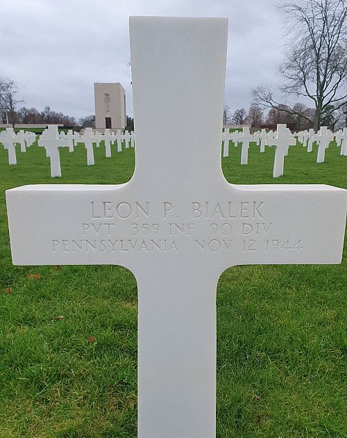 Pvt Leon P. Bialek enlisted in Allentown, Pennsylvania on 22 July 1943.He was first buried at the Temporary American Military Cemetery in Limey, France.