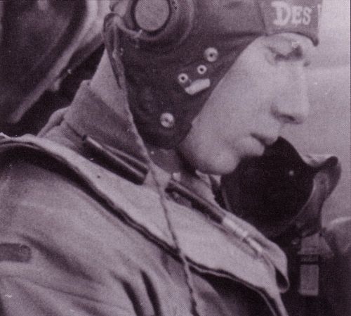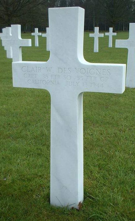 Clair Des Voignes volunteered for the Air Corps of the Army of the United States in Los Angeles, California on 13 April 1942.Statement of Lt Claude L. Chamberlin who flew in the same mission: "I was flying Capt Des Voignes' left wing at about 22,000 feet. We saw three P-47s coming almost towards us at about 2 o'clock position. Des Voignes started a turn to the right to keep them in sight and came in behind them. As we were in this turn, another P-47, flying straight and level came in towards us. I was behind, a little low and to the left of Des Voignes, when I saw this other P-47. Des Voignes could not see it because he was in a turn. The P-47 didn't seem to turn in any way. The P-47 hit the P-38 on the underside of the pilot's nacelle. I was on "C" channel so couldn't call Des Voignes as it happened too fast. Both planes exploded and burst into flames. The largest part I saw was the left motor and inboard section of the P-38. I saw no parachutes open."