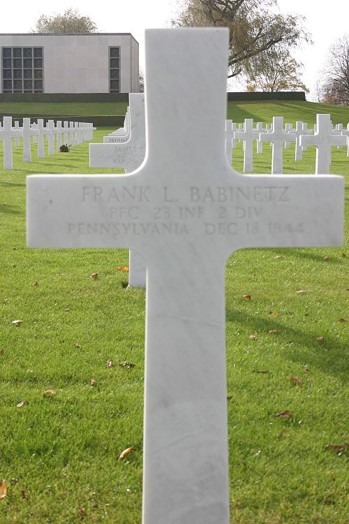 Pfc Frank L. Babinetz enlisted in New Cumberland, Pennsylvania on 9 March 1944.He was wounded in action on 4 October 1944. for this wound, he was awarded the Purple Heart Medal a first time.