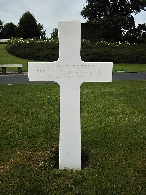T/5 John P. Botkin attended high school for four years and was employed at the Goodyear plant before he enlisted at Camp Perry, Ohio on 4 February 1942.He was first buried at the Temporary American Military Cemetery in Limey, France.