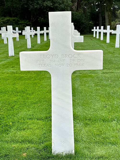 Pvt Lloyd Brock attended high school for three years before he enlisted in Lubbock, Texas on 18 December 1943.He was first buried at the Temporary American Military Cemetery in Limey, France.