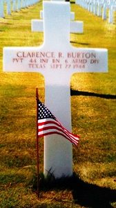 Pvt Clarence R. Burton worked on a farm before he enlisted in Tyler, Texas on 3 November 1943.He was first buried at the Temporary American Military Cemetery in Andilly, France.