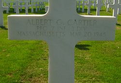 Pfc Albert G. Cartier attended high school for one year and was a production worker, employed by the Winter Bros Company before he enlisted in Boston, Massachusetts on 22 December 1943.He was reported severely wounded in action by artillery shell fragments in the kidneys and vertebrae. On 20 March 1945 he died of his wounds. The exact date when he was reported wounded in action and the location where he died, is not known.
