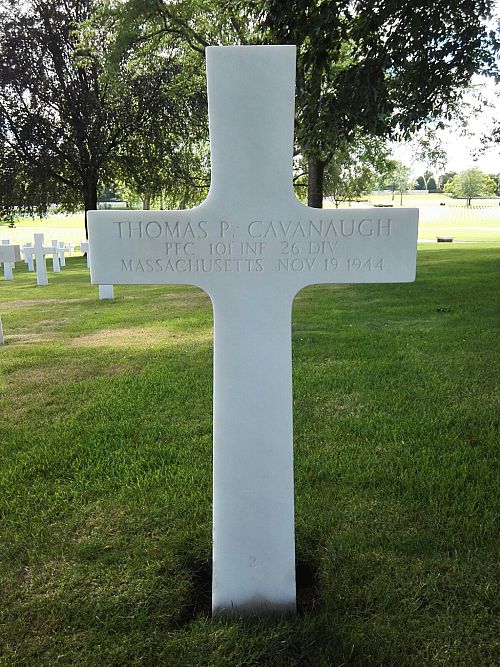Source of information: Peter Schouteten, www.abmc.gov, www.wwiimemorial.com, www.archives.gov - WWII Enlistment Record, www.ancestry.com - Headstone and Interment Record / Cavanaugh Family Tree / U.S. WWII Hospital Admission Card Files, www.findagrave.com, After Action Report 26th Infantry Division
