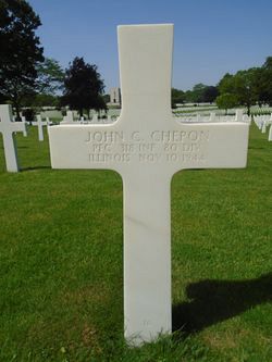 Pfc John C. Chepon was an attendant at Hills bowling alleys before he enlisted in Peoria, Illinois on 13 January 1943. He was sent overseas in September 1944.Source of information: Leo Minne, www.abmc.gov, www.wwiimemorial.com, www.ancestry.com - 1930/1940 Census / U.S. Headstone and Interment Record / U.S. Draft Cards Young Men, www.80thdivision.com