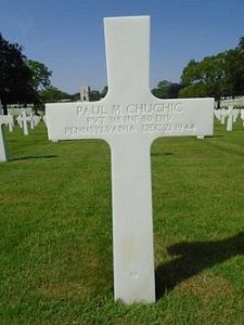 Pvt Paul M. Chuchic attended college for two years and was employed by the Henry Wadsworth Bureau of Recreation before he enlisted in Pittsburgh, Pennsylvania on 15 December 1942.He was reported lightly wounded in action on 4 December when E Company attacked Théding, France.