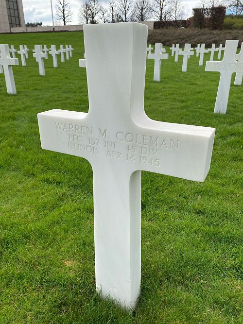 Pfc Warren M. Coleman entered the army in July 1944, and left 26 December for overseas duty.Source of information: Peter Schouteten, www.abmc.gov, www.wwiimemorial.com, www.ancestry.com - Headstone and Interment Record / Kaulay Family Tree / Cook County, Illinois Marriage Index, http://www.45thdivision.org, www.newspapers.com - The Pointer Illinois - 10 May 1945 / 24 May 1945