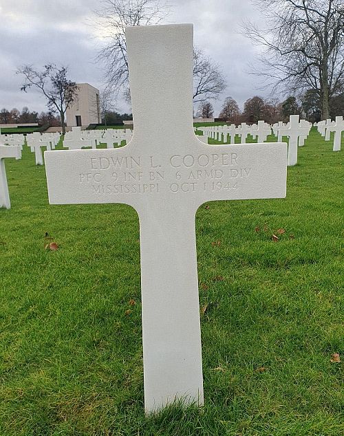 Pfc Edwin L. Cooper attended high school for four years and was a salesman before he volunteered for the Army of the United States in Jackson, Mississippi on 18 March 1942.He was first buried at the Temporary American Military Cemetery in Andilly, France.