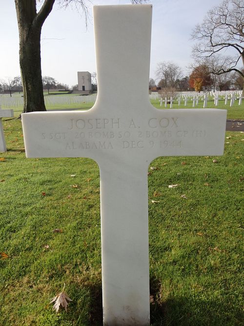 S/Sgt Joseph A. Cox volunteered for the U.S. Army in Fort McClellan, Alabama on 27 November 1942.The airplane was hit by flak which destroyed one engine and caused fuel leakage. The pilot crash landed the airplane after he gave the order to bail out because the right waist gunner refused to leave the airplane.
