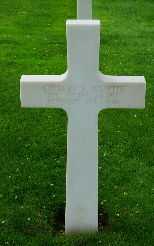 Pfc Gilbert K. Curtis worked on a farm before he enlisted in Jefferson Barracks, Missouri, on 20 July 1944.Source of information: Peter Schouteten, www.abmc.gov, www.wwiimemorial.com, www.archives.gov – WWII Enlistment Record, www.ancestry.com - Headstone and Interment Record / Pruett Family Tree / U.S., Social Security Applications and Claims Index, http://www.45thdivision.org