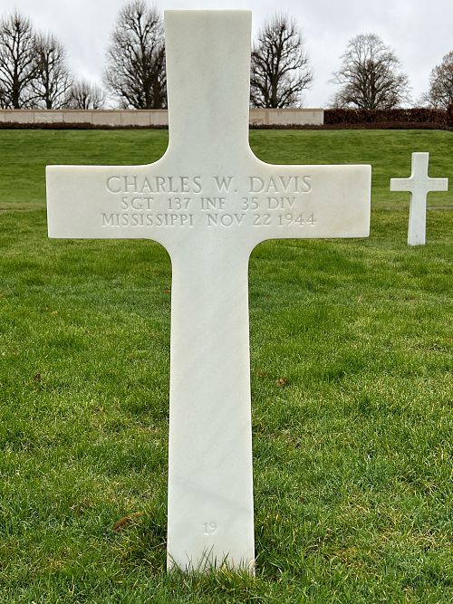 Source of information: Peter Schouteten, The weebly.com website of Charles W. Davis was researched and created by Nathan Guy, www.abmc.gov, www.wwiimemorial.com, www.archives.gov – WWII Enlistment Record, www.ancestry.com - Headstone and Interment Record / U.S. WWII Draft Cards Young Men / Ratterree Family Tree / 1940 Census , After Action Report 35th Infantry Division, www.findagrave.com – Eric Ackerman