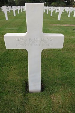 Pfc Lewis R. De Long was employed by the Flint Venetian Blind Company before he enlisted in January 1944. He joined A Company on 6 November 1944.On 24 November 1944, in the vicinity of Bourg-Bruche, France, he was wounded in action by small arms fire at his chin. He was hospitalized until 22 January 1945.