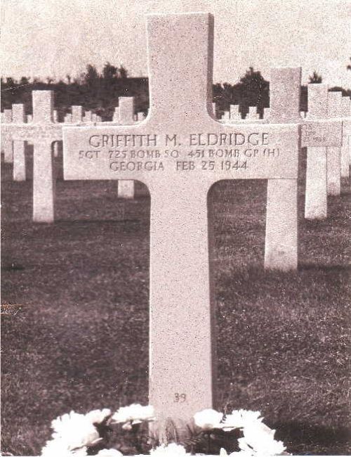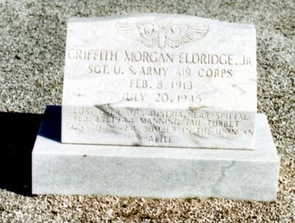 Sgt Griffith M. Eldridge Jr. attended 2 years of college and was a shipping and receiving clerk before he enlisted in Fort McPherson Atlanta, Georgia on 26 January 1943.The airplane was attacked by enemy fighters at about 1140 hours. Gunfire set the #3 engine on fire, and the aircraft went into a steep slide towards the ground.