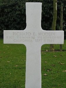 S/Sgt Ricard E. Modlin attended college. He joined the Air Corps of the U.S. Army Reserve in the Presidio of Monterey, California on 17 August 1942.After the war, a surviving crew member, S/Sgt Odell F. Dobson, gave the following statement: "Going to the target we were attacked by enemy fighters (Me-109s). Number three (3) engine was hit and set afire; fire broke out in the bomb bay and we lost the formation as a result of these damages. The airplane went into a shallow dive and the crew prepared to bail out. Before this could be accomplished, however, the airplane started to spin and crashed."