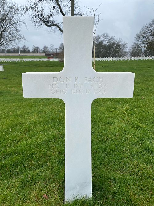 Pfc Don P. Fach was a toolsharpener before he volunteered for the Army of the United States at Fort Hayes, Columbus Ohio on 4 December 1942. He first trained with the field artillery but was later transferred to the infantry. He was sent overseas in July 1944.Source of information: Leo Minne, Kathy McDermott, www.abmc.gov, www.wwiimemorial.com, www.archives.gov – WWII Enlistment Record, www.ancestry.com – 1930/1940 Census / U.S. Headstone and Interment Record / Ohio Birth Index, A footsoldier for Patton / Michael C. Bilder James G. Bilder, The 5th Infantry division in the ETO