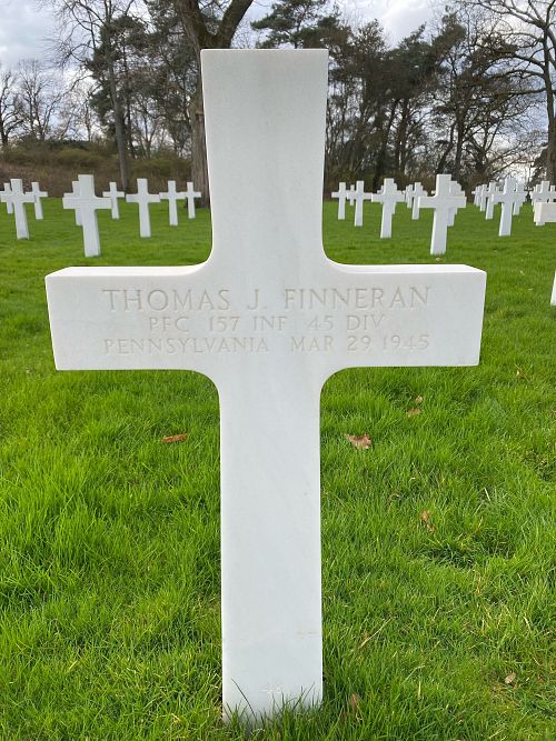 Pfc Thomas J. Finneran attended high school for 3 years before he enlisted in Philadelphia, Pennsylvania on 21 July 1944.Source of information: Peter Schouteten, www.abmc.gov, www.wwiimemorial.com, www.archives.gov - WWII Enlistment Record, www.ancestry.com - Headstone and Interment / Pennsylvania Veteran Compensation Application Files WWII / 1930 Census, http://www.45thdivision.org
