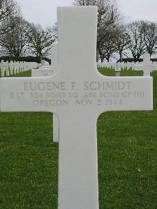 2nd Lt Eugen F. Schmidt was a graduate of the local high school with the class of 1942 and had played freshman football at the University of Washington. While in high school he was active in student affairs and took a leading role in the school operetta "Firefly". 2nd Lt Schmidt went overseas in September 1944. He joined the Air Corps of the U.S. Army Reserve as a private in Seattle, Washington on 9 December 1942.The aircraft took a direct hit from flak just after bombs away. There was an explosion and the plane broke into many flaming pieces. No parachutes were seen. Sgt Bacon, a crew member of another plane, saw two men come out of the plane. He couldn't say whether they had jumped or been thrown clear. He saw no parachutes.