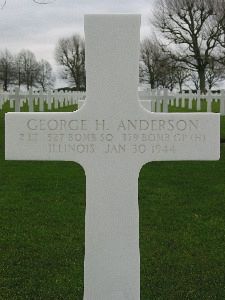 Lt. George H. Anderson graduated from Englewood High School and attended Northwestern University for two years. He was employed in the accounting department at Armour & Co when he enlisted in the Air Corps in May 1942.The mission was to bomb the aviation industry plants of Brunswick. Due to cloud cover the city was bombed as a target of opportunity. On the way back to England, the bombers were attacked by German fighters who were sent up to intercept them. The plane crashed north of Bergen aan Zee, near Schoorl, on the Dutch coast near the Pirolavlakte.