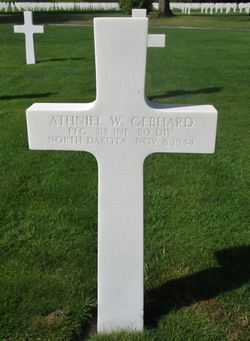Pfc Athniel W. Gebhard was a carpenter employed at Helliwell & Gebhard before he enlisted at Fort Snelling, Minnesota on 17 February 1944.Source of information: Leo Minne, www.abmc.gov, www.wwiimemorial.com, www.ancestry.com - 1930/1940 Census / U.S. Headstone and Interment Record / U.S. Draft Cards Young Men, www.80thdivision.com