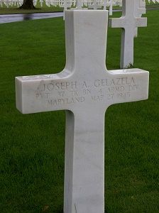 Pvt Joseph A. Gelazela enlisted in Baltimore, Maryland on 12 January 1944.On March 26, 1945, Task Force Baum made a daring action into enemy territory to liberate Allied prisoners held by the Germans in a POW Camp Oflag XIII-B near Hammelburg, Germany. Task Force Baum was made up at the 37th Tank Battalion and 10th Armored Infantry Battalion a total of 296 men. Against ever-stiffening resistance by an enemy who thought an entire division had broken through the Main River defense line, Capt Baum's decimated column finally reached the stockade near dark on 27 March. After a hot fight, the prisoners were released, armed, and mounted on the back decks of Company C's tanks for the ride back to friendly lines. Capt Baum directed the remnants of his force northeastward, but by now the area was swarming with German infantry and armor. By morning of the 28th all the task force's vehicles had been knocked out. The force then broke into groups of fours and fives and attempted to exfiltrate back to American lines. Finally, about 35 men made it. The rest were killed or captured. Of the 296 officers and men of Task Force Baum, 32 were wounded, 9 killed and 16 who were missing in action are still unaccounted for. Of the remaining 239, virtually all, including Capt Baum, were prisoners at one time or another. Although they did not accomplish their mission successfully, the tankers and infantry of Task Force Baum contributed a great deal to the Central European Campaign. No less than an entire German Corps was diverted to the seeking out and destruction of the two company task forces. Only the loss of the means to fight on kept them from continuing. The story of Task Force Baum will serve as a stirring example of individual courage and small unit leadership as long as nations have armies.