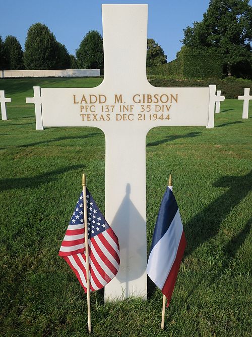Pfc Ladd M. Gibson worked on his own farm before he enlisted in Lubbock, Texas on 2 July 1942.He served in the airborne for a time, but he was in the infantry at the time of his death. He died of wounds received the preceeding day.