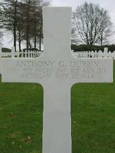 Anthony Durbin was first buried at the Temporary American Military Cemetery of Zon, The NetherlandsSource of information: Peter Schouteten, Astrid van Erp, www.wwiimemorial.com, www.archives.gov, www.ww2-airborne.us, www.ancestry.com - Headstone and Interment Record