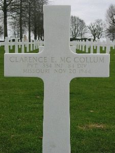Pvt Clarence E. McCollum enlisted at Jefferson Barracks, Missouri on 20 April 1944.Source of information: Peter Schouteten, Rick Demas, Jimmie Earl McCollum (son), www.wwiimemorial.com, www.archives.gov - WWII Enlistment Record, www.ancestry.com - U.S., Headstone and Interment Records for U.S. Military Cemeteries on Foreign Soil