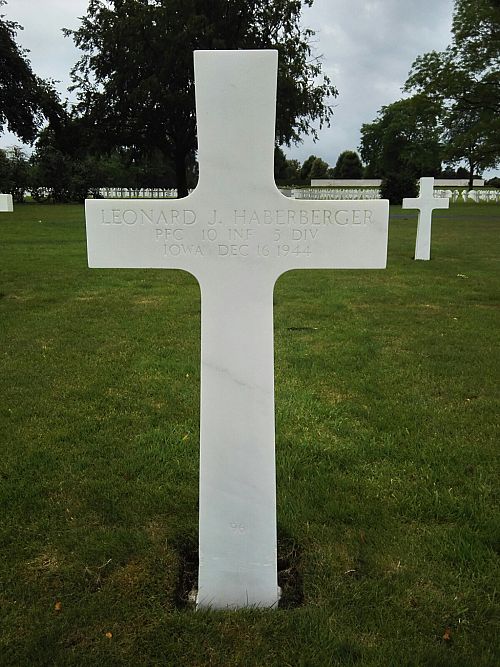 Pfc Leonard J. Haberberger enlisted on 17 February 1944.Source of information: Leo Minne, www.abmc.gov, www.wwiimemorial.com, www.archives.gov – WWII Enlistment Record, www.ancestry.com – 1930/1940 Census / Iowa WWII Bonus Case Files for beneficiaries / Headstone and Interment Record / William Croghan Family Tree, A footsoldier for Patton / Michael C. Bilder James G. Bilder, The 5th Infantry Division in the ETO