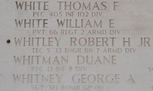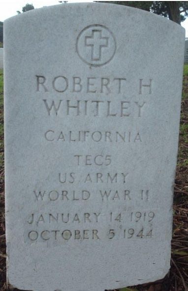 T/5 Robert H. Whitley Jr. was a chauffeur before he joined the Regular Army in Jacksonville, Florida on 8 August 1940.He was manning a machine gun when a German mortar shell landed in his foxhole, which killed him instantaneous. The explosion hit his foxhole directly, and it was believed at the time that his body was destroyed. He was reported missing in action, presumed dead, since his body could not be recovered and circumstances clearly suggested that he had been killed. A subsequent search in the area in 1950 by Army Graves Registration Teams failed to locate his body, and he was declared as non-recoverable on 6 November 1950.