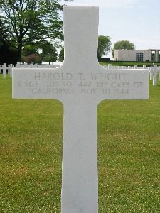 A/C-47 aircraft, number 43-15131 piloted by 1st Lt Roger L. Aldrin 305th Troop Carrier Group had a mid air collision at approximately 1130 hours, 30 November 1944, near Rance, Belgium.Staff Sergeant Harold T. Wright was killed November 30 in Rance, Belgium in an aircraft accident. Sgt Wright served as a radio operator on a C-47 Skytrain and was charged with the repair and operation of radio communication on his troop and cargo-carrying plane. He went overseas almost a year ago and was in the first invading airwave on 'D' day, his first combat invasion in the European theater of operations was a part of the gigantic troop carrier flotilla that dropped Allied paratroopers on fortress Europe, spearheading the attack on the Normandy beachheads.