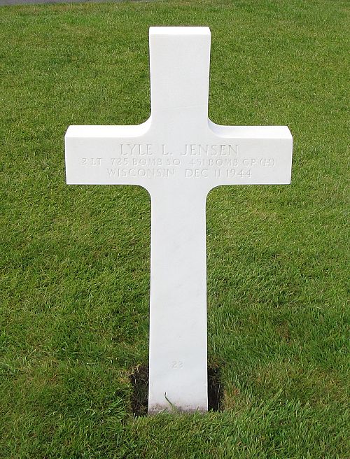 "Aircraft Number 44-41114, piloted by 2nd Lt Lyle L. Jensen. This ship was flying number two position. Shortly after we released our bombs, he appeared to receive a direct flak hit in the bomb bay. The bomb bay then burst into flame and about five or six seconds later, the ship exploded. No parachutes were seen to emerge from the aircraft either before or after the explosion."