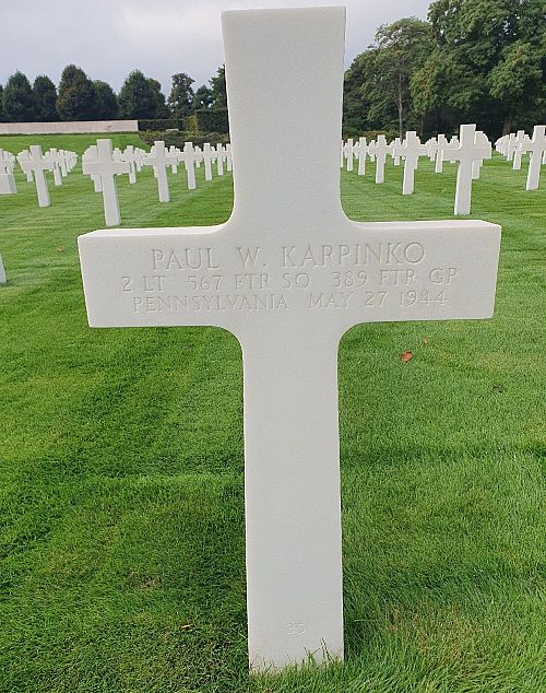Lt. P. W. Karpinko was seen to bail out and then our B-24 while in a flat spin is believed to have separated him from his parachute. German interrogator at Wetzlar Dulag-Luft informed me that Lt P. W. Karpinko’s dog tags were found on a crushed body.