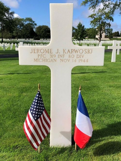 Pfc Jerome J. Karwoski attended high school for two years and was employed by the Bohn Aluminium and Brass Company when he enlisted on 16 February 1942.On 13 November 1944 he was reported severely wounded in action in the vicinity of Bacourt.