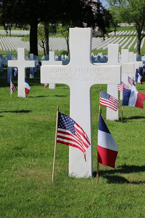 S/Sgt John J. Kelleher Jr. attended Washington State College after graduating from Ellensburg High School and worked on a farm before he enlisted in Tacoma, Washington on 14 August 1942. He was sent overseas in May 1944.He was reported wounded in action on 20 September 1944 for which he was awarded the Purple Heart Medal a first time.