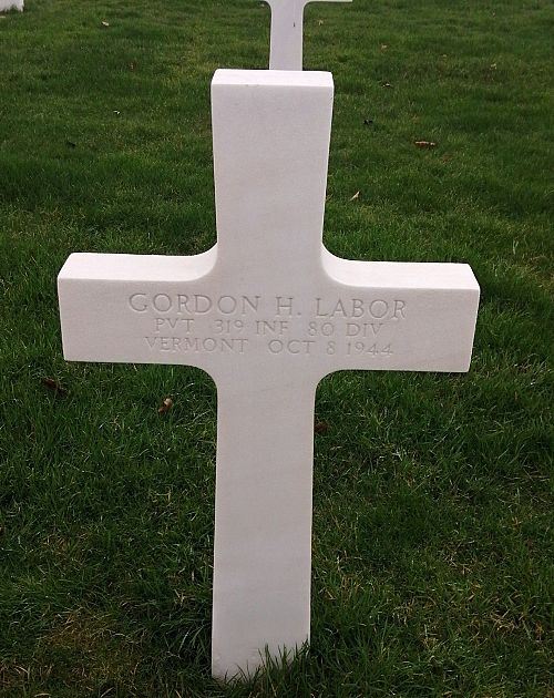 Pvt Gordon H. Labor attended high school for two years and was a production worker before he enlisted in New Haven, Connecticut on 28 January 1944.He was severely wounded in action by artillery shell fragments and evacuated to the 305th Medical Clearing Station where he died of wounds.
