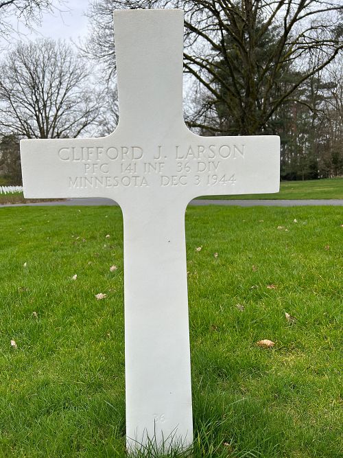 Pfc Clifford J. Larson was sent overseas in May 1944.He was reported wounded in action on 26 August 1944. After recovering, he rejoined his unit. For this wound he was awarded the Purple Heart Medal a first time.