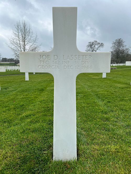Pfc Joe D. Lasseter was employed by the Bibb Manufacturing Company before he enlisted in February 1944 and was sent overseas in August of the same year.Source of information: André Koch, www.abmc.gov, www.wwiimemorial.com, www.ancestry.com - 1930 Census / Headstone and Interment Records / U.S. WWII Draft Cards Young Men, 36thID-roster-part-2.pdf, 142ndaar-.pdf, https://36th-id.frb.io/