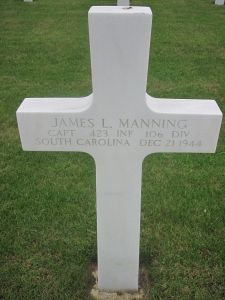 James Manning was a 1942 graduated from The Citadel, where he majored in history. His activities at college included freshman football, Pee Dee Citadel Club and Varsity Boxing Team.Although Capt Manning's official date of death is 21 December 1944, records prove he was killed on the first day of the Battle of the Bulge on 16 December 1944. That day, Capt Manning was leading his men against a German attack on Bleialf.