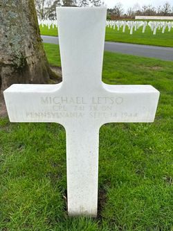 Cpl Michael Letso was a miner, employed by the Ehenbury Coal Co. before he enlisted in Altoona, Pennsylvania on 11 May 1942.Source of information: Leo Minne, www.abmc.gov, www.wwiimemorial.com, www.ancestry.com – 1930/1940 Census / U.S. Headstone and Interment Record for U.S. Military Cemeteries on Foreign Soil / U.S. Draft Cards Young Men / US WW2 Hospital Admission Cards / Roser Family Tree
