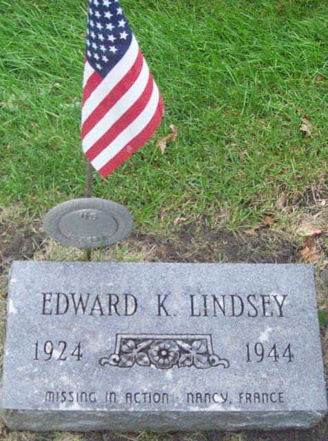 Pfc Edward K. Lindsey attended high school for four years before he enlisted in Kalamazoo, Michigan on 29 April 1943.He was officially declared dead one year and one day after he was reported missing in action. At that time his unit was fighting in the vicinity of Nancy, France.