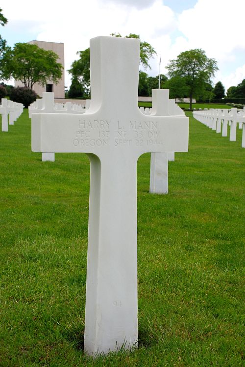 Pfc Harry L. Mann attended high school for one year and was a lumber inspector before he enlisted in Portland, Oregon on 3 January 1944.He was killed by artillery shell fragments to his chest.
