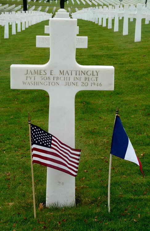 Pvt James E. Mattingly was an embalmer and undertaker before he joined the Regular Army in Seattle, Washington on 19 February 1946.He was killedduring a practice jump in the vicinity of Heddernheim, Germany, when his parachute failed to open due to an incorrect hookup.