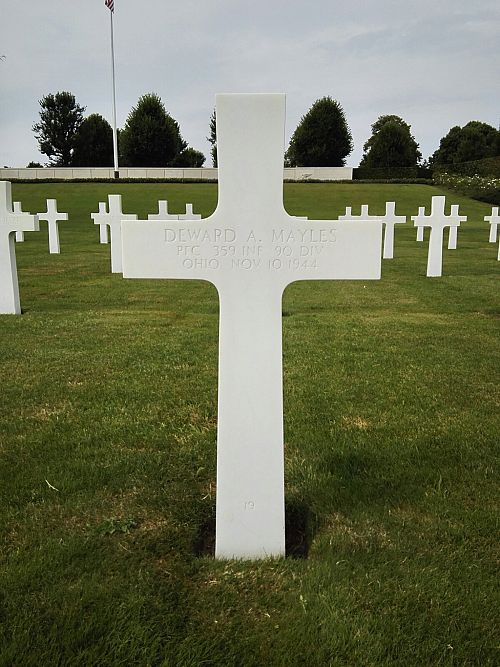 Pfc Deward A. Mayles worked on a farm before he enlisted in Clarksburg, West Virginia on 11 May 1943.He was first buried at the Temporary American Military Cemetery in Limey, France.