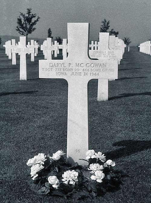 T/Sgt Daryl P. McGowan was a driver before he volunteered for the Air Corps of the Army of the United States at Camp Dodge, Herrold, Iowa, on 5 October 1942.Report of the pilot, 1st Lt Lamar J. Dunn who was one of the surviving crew members: "Just after we dropped our bombs, we got a hit, which knocked out the windshield. Ten or fifteen seconds later, we received a direct hit in the vicinity of the flight deck. As soon as we were hit, fire broke out in the flight deck. About the left half was on fire. Controls were out and there was no rudder, elevator or aerilon control. I was unable to contact the crew by inter-phone. I pushed the bailout signal and held it for a few seconds. I glanced at my altimeter and we had reached approximately 1,200 feet. At that time, the ship came out on almost an even keel. During this time, I hadn't contacted any members of the crew. I was not aware of what was happening in any part of the ship in the pilot compartment. The next thing I remember, I was falling through space. I opened my chute. There were two chutes below mine."